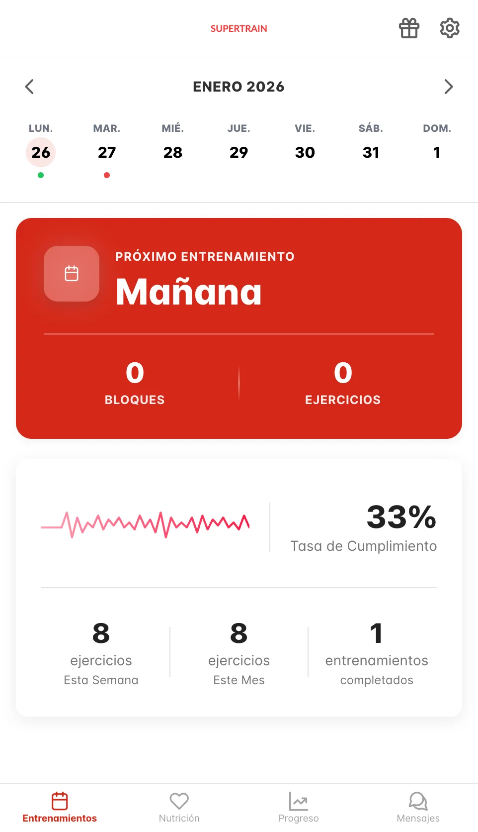 La pantalla de inicio muestra tu calendario mensual, el próximo entrenamiento programado y un resumen de tu progreso.
