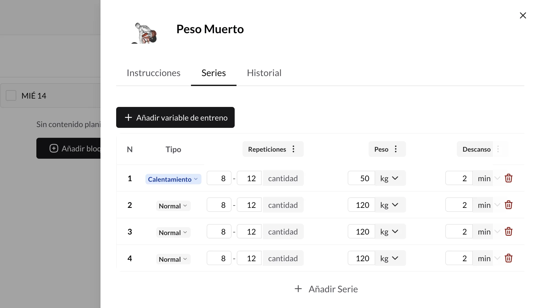 Además de indicar instrucciones de texto libre para cada ejercicio, puedes registrar entrenamientos con variables estructuradas para obtener estadísticas avanzadas y realizar un control de carga efectivo.