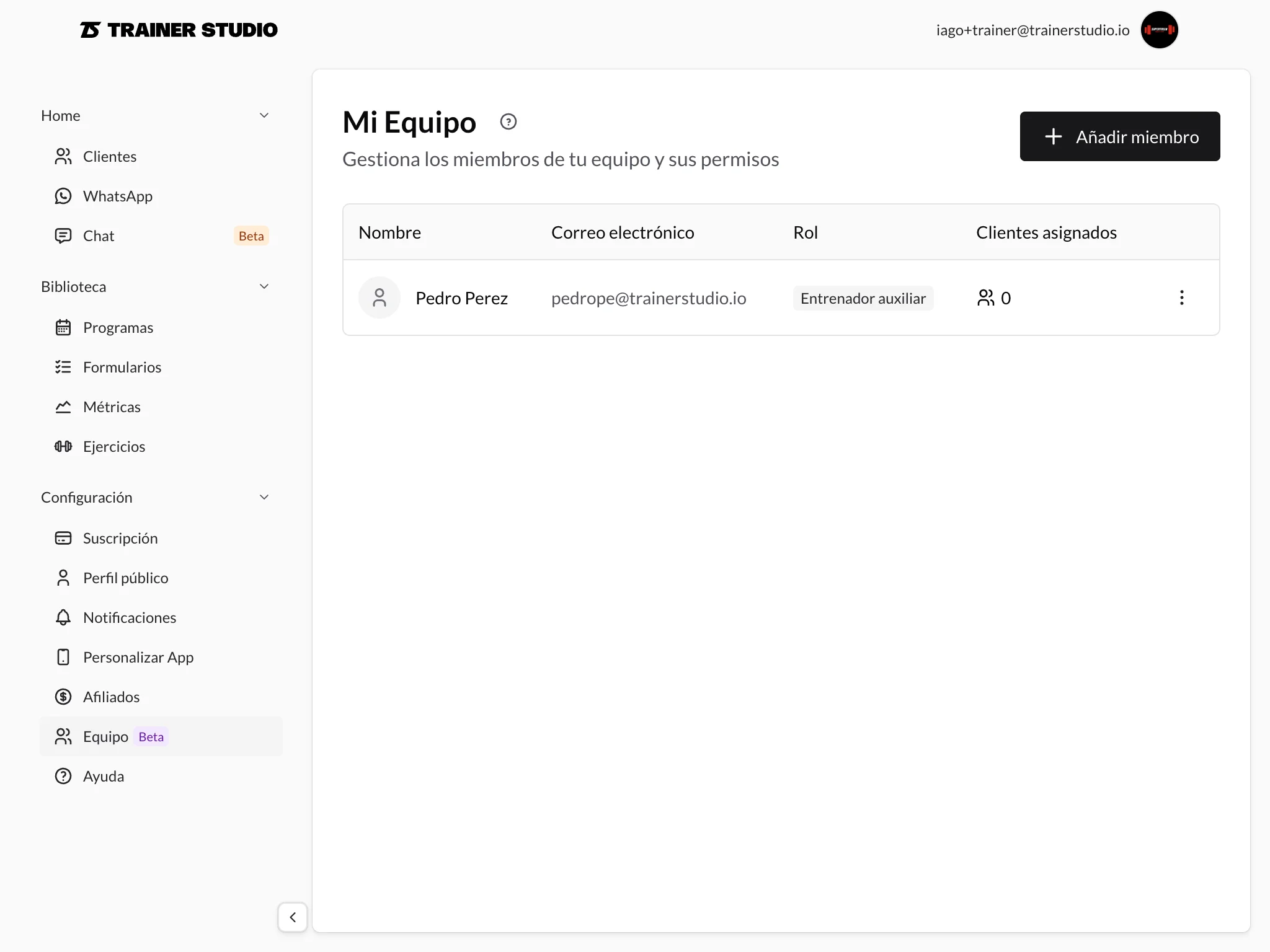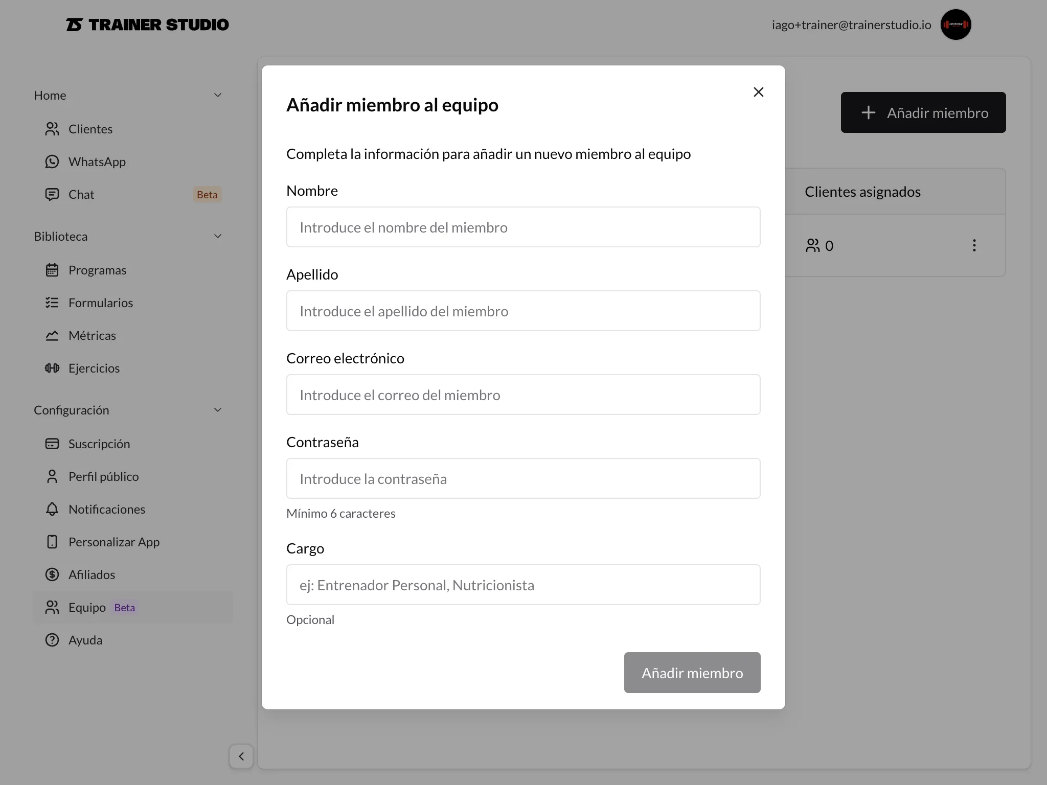 To add a new employee, go to the "My Team" section from the sidebar menu and click "Add member". Fill in the basic information: first name, last name, email (used to log in), and a temporary password (the employee can change it later). You can also add an optional job title such as "Personal Trainer", "Nutritionist", or "Physiotherapist".